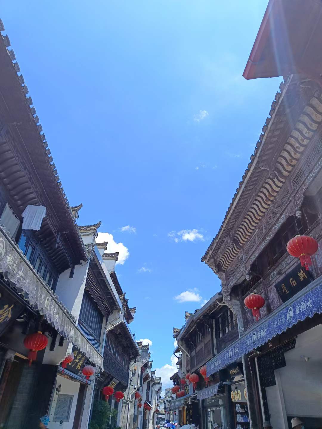 經(jīng)過3個多小時的車程,我們首先來到的是屯溪老街。屯溪老街座落在安徽省黃山市屯溪區(qū)中心地段,北面依山,南面傍水,全長1272米,由不同年代建成的300余幢徽派建筑構成的整個街巷,呈魚骨架形分布,西部狹窄、東部較寬。因屯溪老街坐落在橫江、率水和新安江三江匯流之處,所以又被稱為流動的"清明上河圖",是中國保存最完整、最具有南宋和明清建筑風格的古代街市,也是中國"全國重點文物保護單位"。